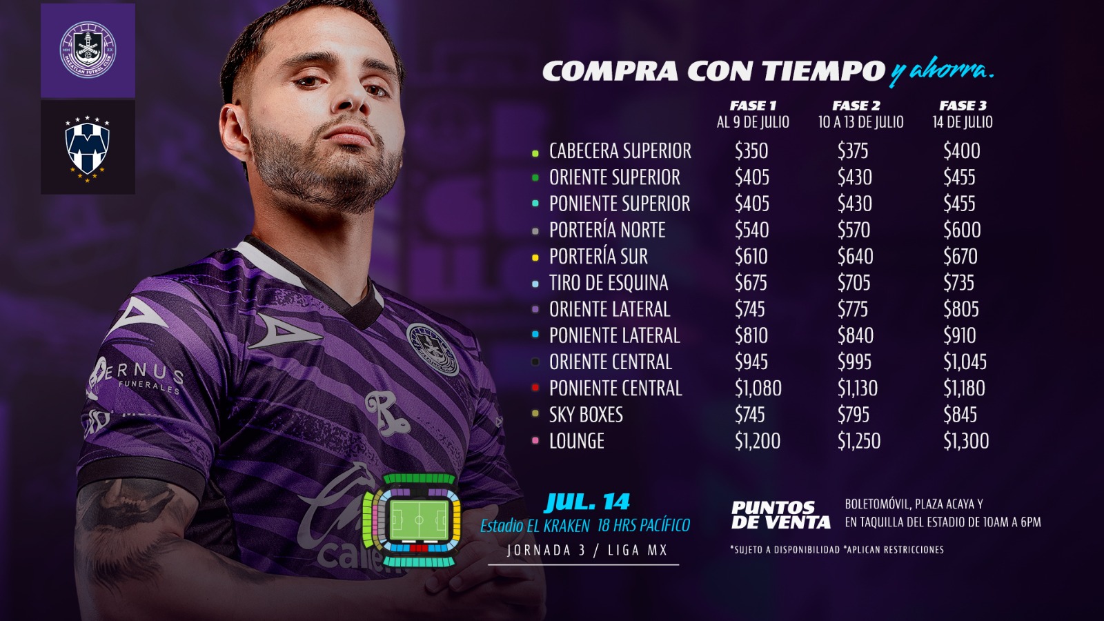 Mazatlán F.C. se prepara para recibir la visita en el estadio Kraken de los Rayados de Monterrey el próximo 14 de julio, en la jornada 3 del Apertura 2023 de la Liga MX, por ello inició a la venta los boletos de dicho encuentro.