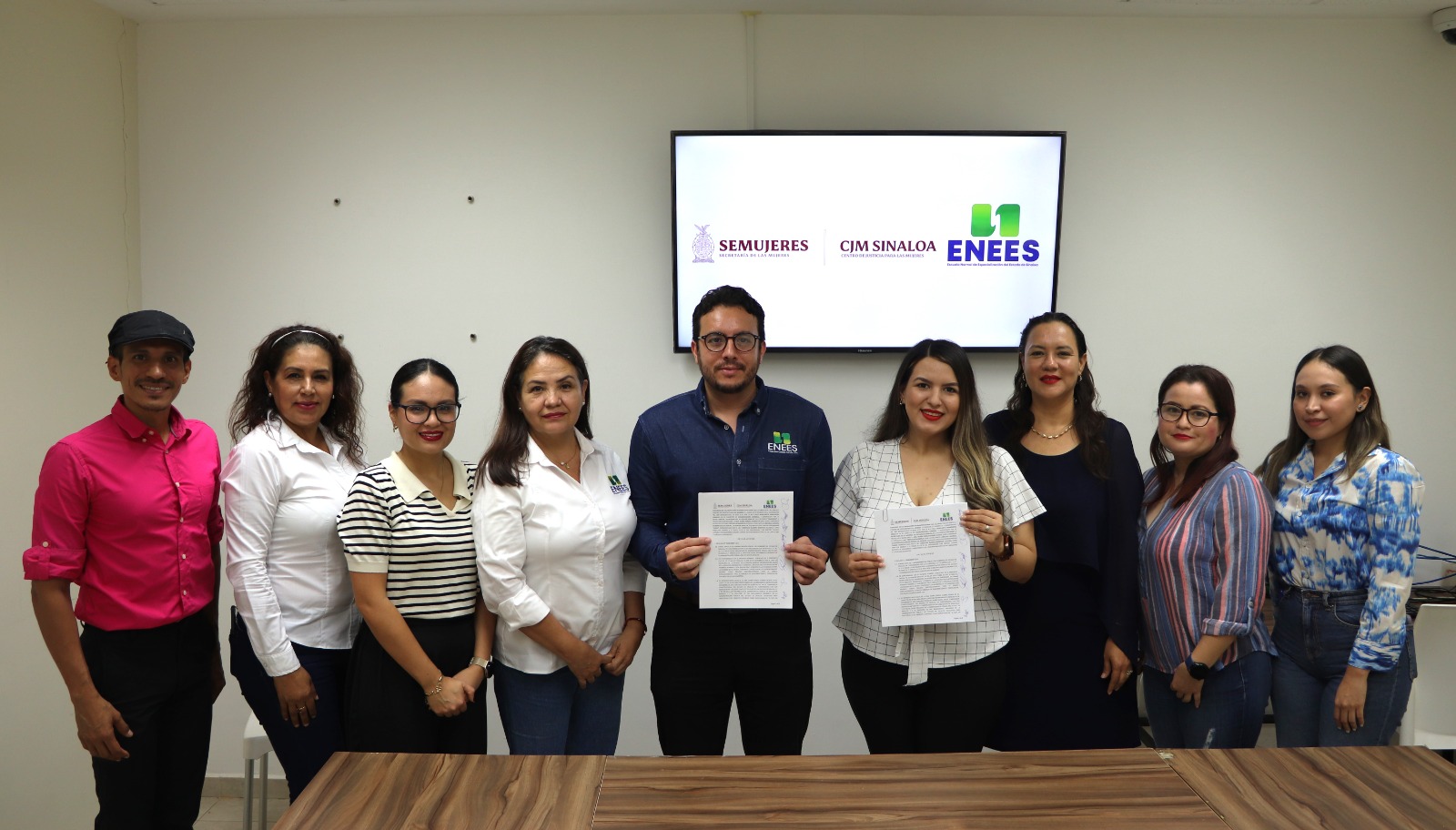 Acudieron a la firma del convenio Dra. María de Jesús López Álvarez, Directora Académica de la ENEES, Lcda. Marcela Adriana Flores Moreno, Directora Jurídica y Operativa del CJM Sinaloa y equipo de trabajo de ambas instituciones.