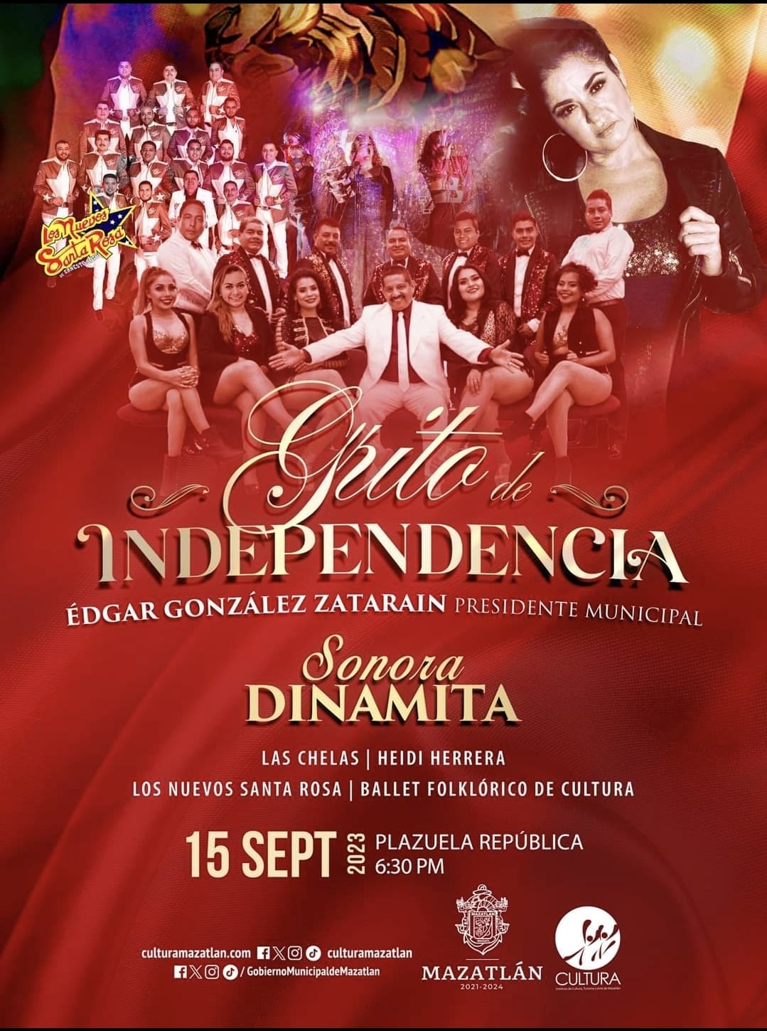 A las once de la noche el Presidente Municipal de Mazatlán, Edgar González dará el tradicional grito de Independencia que será precedido por una espectacular lluvia de juegos pirotécnicos que dejarán el ambiente encendido para recibir a la 100% Explosiva Sonora Dinamita, agrupación estelar que en punto de las 23:15 horas desplegará su amplio repertorio para invitar a bailar a las familias mazatlecas.