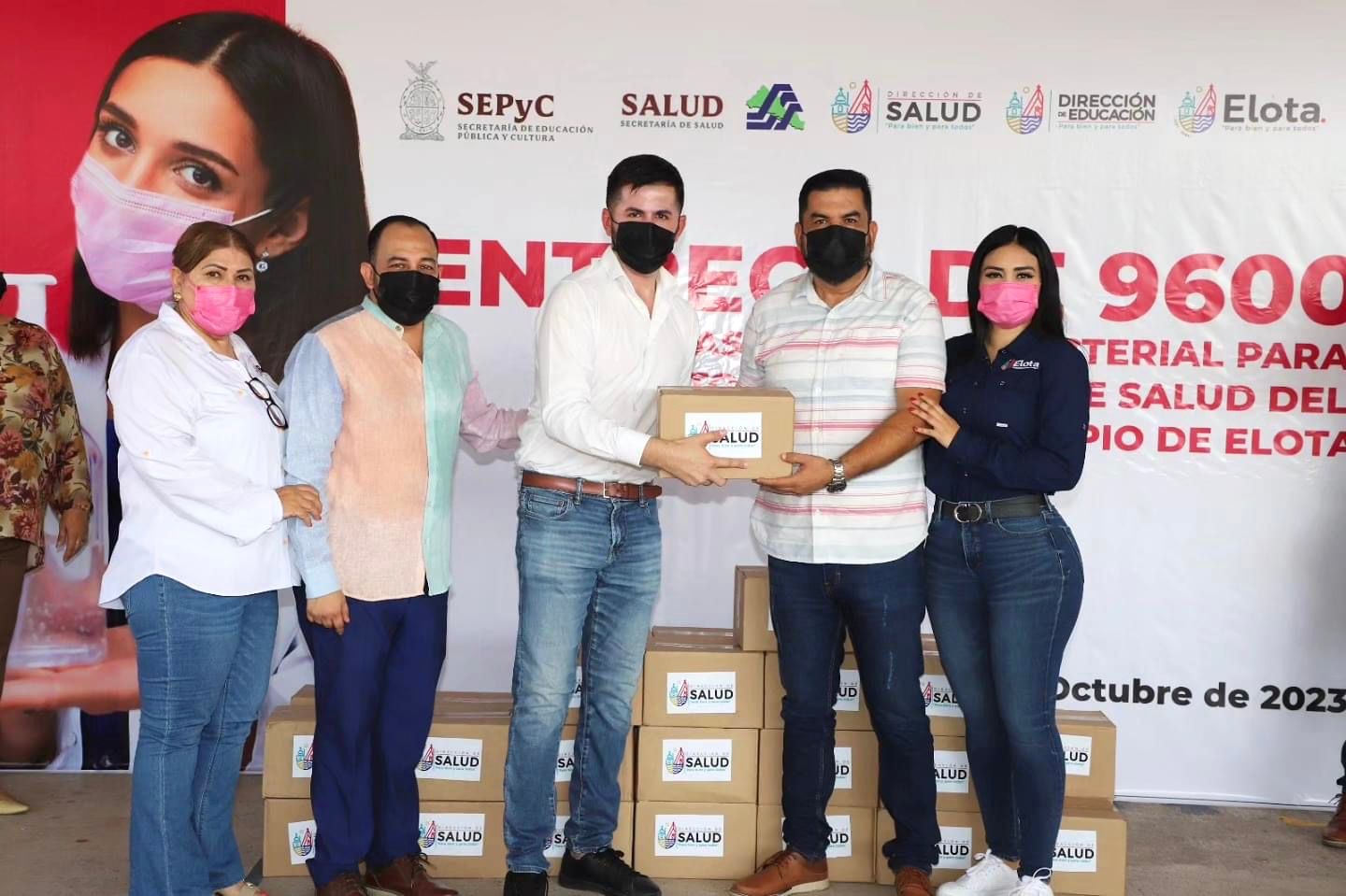 La alcaldesa Ana Karen Val Medina y el coordinador estatal de Escuelas y Salud de la Secretaría de Educación Pública y Cultura en Sinaloa, José Alberto Cerón Castro, entregaron los insumos a los representantes de los sectores de preescolar, primaria y secundaria técnica, Hospital General La Cruz, IMMS Bienestar, ISSSTE y Centro de Salud.