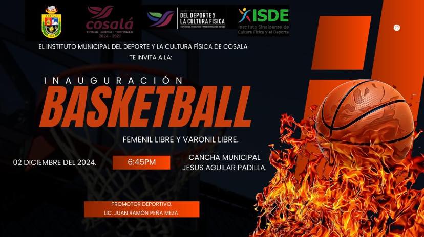 Cosalá, Sinaloa.- El Instituto Municipal del Deporte y la Cultura Física de Cosalá invita a toda la comunidad a asistir a la gran inauguración del Torneo de Basquetbol Femenil y Varonil Libre, que se llevará a cabo el próximo 2 de diciembre de 2024. El evento se celebrará en la Cancha Municipal Jesús Aguilar Padilla, a partir de las 6:45 pm.
