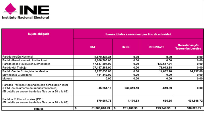 Según la auditoría, los partidos no pagaron 61 millones de pesos en impuestos al SAT, 231 mil pesos al IMSS y 229 mil al Infonavit. El partido con más adeudos es el PT, con atrasos de más de 27 millones de pesos. Le sigue el ya extinto PRD (17 millones de pesos), el PRI, con 8 millones de pesos y el PVEM, con más de 5 millones de pesos.