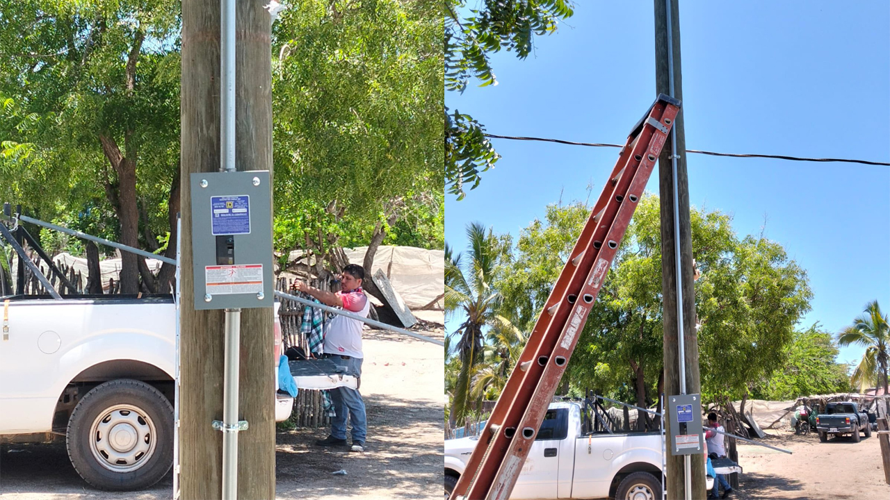 Barras de Piaxtla, San Ignacio, Sin.- En cumplimiento a las instrucciones del Presidente Municipal Luis Fernando Loaiza Bañuelos, personal del área de alumbrado público llevó a cabo la instalación de un nuevo sistema de alimentación eléctrica en la cancha de usos múltiples de la comunidad de Barras de Piaxtla.