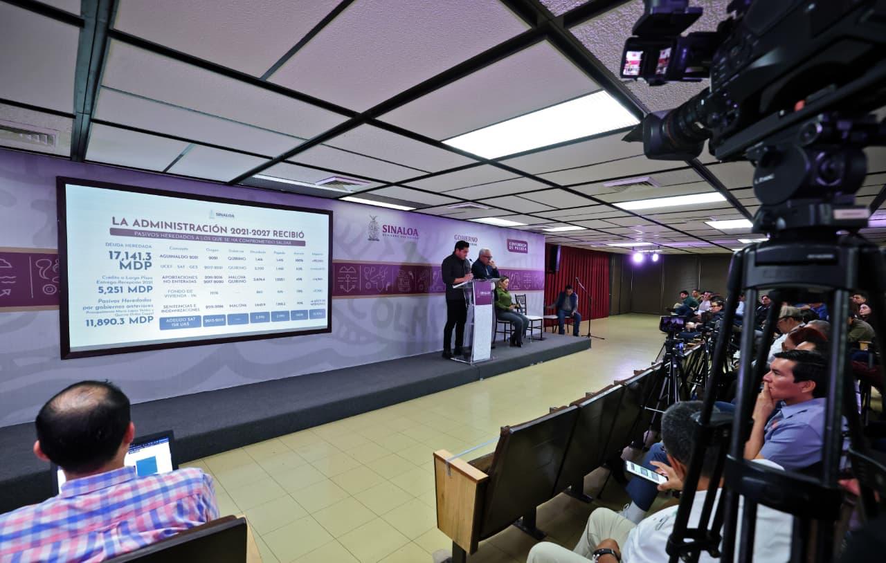 Culiacán, Sin.- Durante la Conferencia Semanera del gobernador Rubén Rocha Moya, el secretario de Administración y Finanzas, Joaquín Landeros Guicho, informó que la presente administración estatal recibió una deuda heredada principalmente de los gobiernos de Mario López Valdez y de Quirino Ordaz Coppel, por un monto de 17 mil 141 millones de pesos, que se compone por 11 mil 890 millones de retenciones no enteradas, que no tienen fuente de pago, más los 5 mil 251 millones de pesos de deuda a largo plazo.